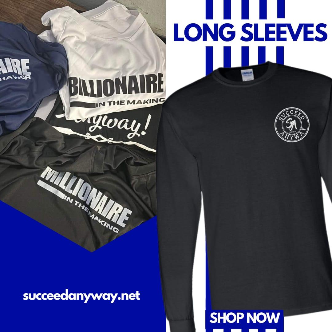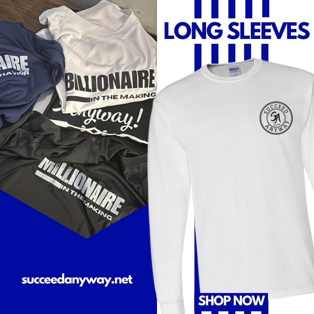 Succeed anyway, billionaire behavior, a long sleeve 100% quality cotton T-shirt. White with black writing and logo on top back